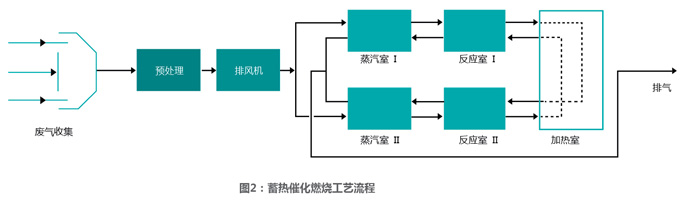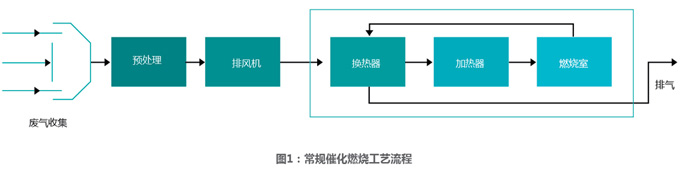 应根据废气产生的工艺、设备、排放特征、流量、组分、温度、压力和污染的性质等因素综合分析后的选择工艺路线。根据对废气外加热方式的不同,催化燃烧工艺可以分为常规催化燃烧工艺和蓄热式催化燃烧工艺