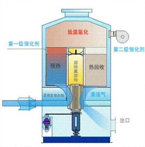 经过预热的废气,通过催化剂层使之燃烧。由于催化剂的作用,催化燃烧法废气燃烧的起始温度约为250~300摄氏度,大大低于直接燃烧法的燃烧温度650~800摄氏度,高温气体再次进入热交换器,经换热冷却,以较低的温度经风机排入大气。