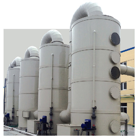 塔内填料层作为气液两相间接触构件的传质设备。喷淋塔废气净化装置塔底部装有填料支承板,填料以错综方式放置在支承板上。填料的上方安装压板,以防被上升气流吹动。喷淋液从塔顶经液体分布器喷淋到填料上,并沿填料表面流下。气体从塔底送入,经气体分布装置分布后,与液体呈逆流连续通过填料层的空隙,在填料表面上,气液两相密切接触进行传质。