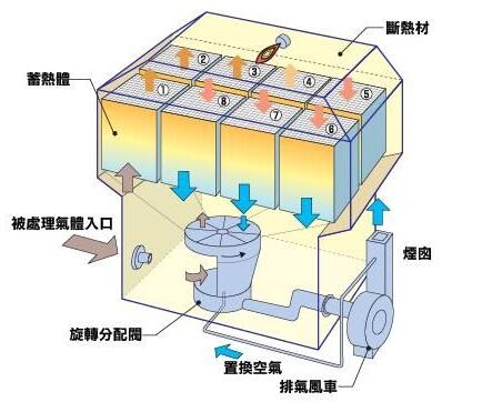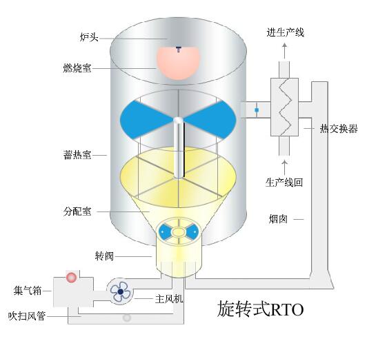 蓄热式热力焚烧炉采用天然气直接燃烧有机废气,在750~850℃温度下,将有机分子分解为CO2和H2O,燃烧后的烟气通过蓄热式陶瓷砖将热量积蓄在陶瓷内,预热有机废气,然后再排放,废气的进出方向通过切换阀的自动切换,循环工作,RTO可以充分回收燃烧有机分解热能,使得系统能耗大大的降低。